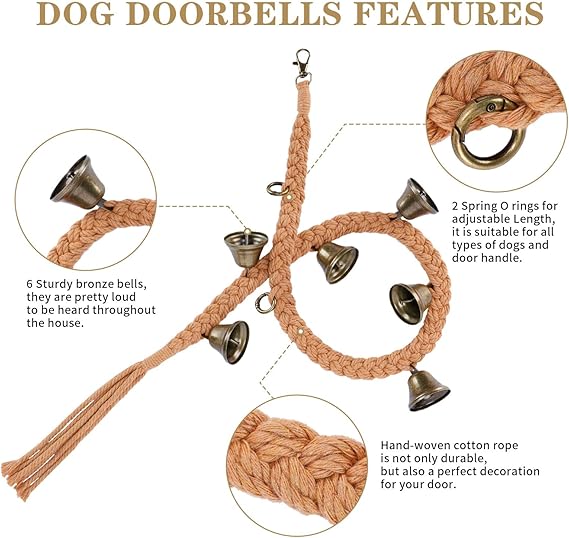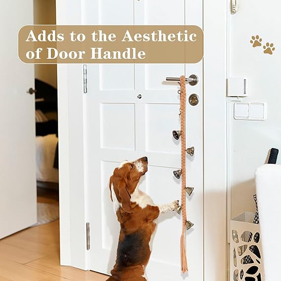 Dog Bell for Door Potty Training, Cotton Handwoven Dog Doorbell with 6 Extra Loud Bells for Dog Training, Adjustable Hanging Door Bell for Small Medium Large Dogs to Ring to Go Outside, Beige