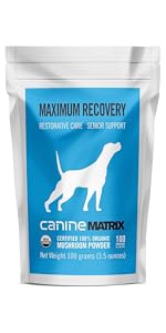 - Mushroom Matrix Canine Organic Mushroom Powder Supplement Maximum Recovery & Senior Support For Dogs & Cats: Contains organic mushroom powder created for dogs & cats to provide daily senior support & restorative care. 100 servings for a 50 lb dog (packaging may vary)