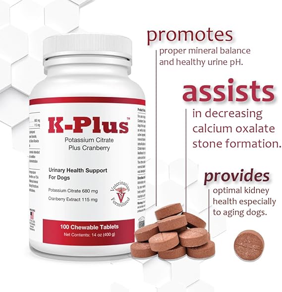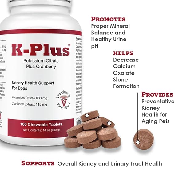 - DECREASE CALCIUM OXALATE STONE FORMATION - K-Plus potassium citrate plus cranberry supplement for urinary tract is a Veterinarian formulated dietary supplement for dogs. Dogs that have calcium oxalate stones need to be fed a therapeutic diet for life. This Supplement contains ingredients known to aid in the prevention of urinary stone formation. Cranberry extract has been proven to enhance urinary tract health and help decrease the possibility of calcium oxalate stone formation.