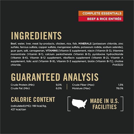 Make meals exciting with Purina Pro Plan COMPLETE ESSENTIALS Beef and Rice Entree Classic adult wet dog food. This Purina wet dog food uses real beef as the first ingredient for tempting flavor with no artificial colors, flavors or preservatives. Our canned pate wet dog food includes highly digestible rice along with other high-quality ingredients, including nutrients to help support his healthy skin and coat. The tempting taste and tender texture enrich his dining experience, and an optimal protein level helps promote his ideal body condition. High-quality protein in our can wet dog food pate helps build his lean muscles. This Pro Plan wet dog food contains 23 essential vitamins and nutrients and 100 percent complete and balanced nutrition for adult dogs. Pair outstanding nutrition with exceptional taste in Purina Pro Plan COMPLETE ESSENTIALS wet dog food at feeding time. We proudly manufacture this Purina Pro Plan beef and rice canned wet dog food formula at Purina-owned facilities.