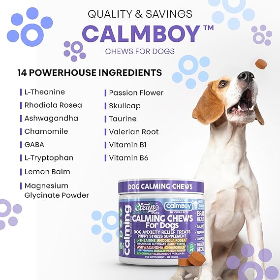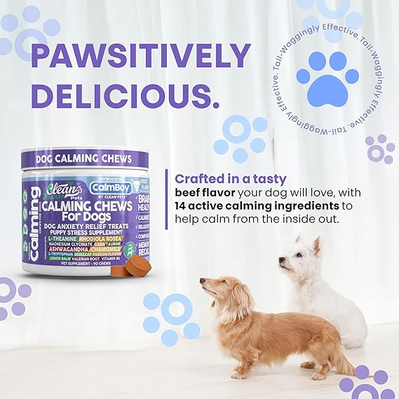 Clean Nutra Calming Chews for Dogs, Dog Anxiety Relief Supplement, L Theanine Ashwagandha Rhodiola GABA Magnesium Valerian Natural Ingredients, 90 Chews, Beef Flavor