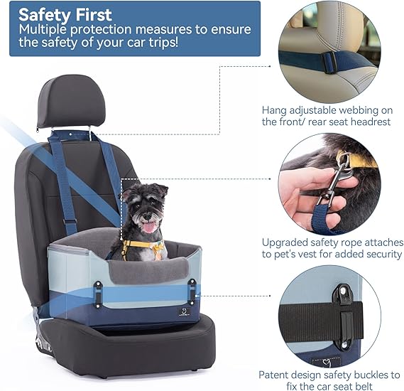 - Secure & Adjustable Pet Car Seat: Our dog car seat features patent buckles to lock onto car seat belts and an adjustable clip-on safety leash to keep pets safely in place. The headrest strap ensures a snug fit in any vehicle, making it the safest small dog car seat for travel