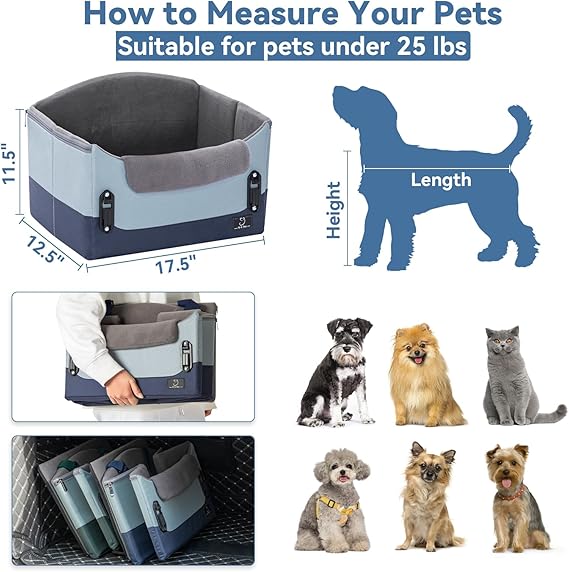 - Perfect Fit for Small Dogs & Puppies: Measuring 17.5"L x 12.5"W x 11.5"H, this dog car seat for small dogs is ideal for pets up to 25 lbs, including Chihuahuas, French Bulldogs, Shih Tzus, Yorkies, Mini Dobermans, Pomeranians, and Maltese. The puppy car seat provides a secure, cozy spot for stress-free car rides