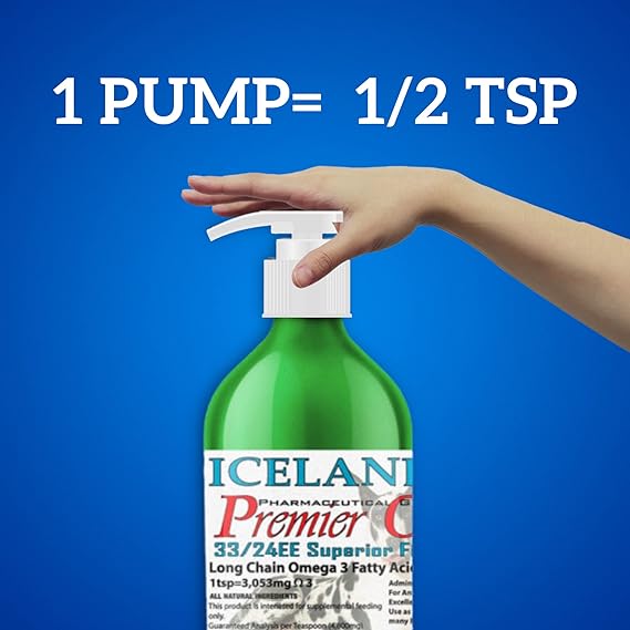 Iceland Pure Omega 3 fish oil supplement is formulated to give larger dog breeds the necessary nutrition needed to support and maintain optimal health, energy, and longevity with minimal possible amount of fish oil (1 teaspoon has over 3,000mg of Omega 3 Fatty Acids, 3 times the potency of most fish oil in the market including Iceland Pure fish oils). Dogs thrive on a healthy diet high of omega-3 fatty acids - EPA and DHA. EPA among many other ailments is an anti-inflammatory, reducing inflammation due to arthritis and allergies. DHA among many other ailments supports the central nervous system, brain and retina. Iceland Pure Premier Omega 3 Fish Oil can reduce the risk of kidney failure and heart disease and for Breeders Omega 3 fatty acids creates an upsurge of sperm creation. The healthy fats nourish your dog’s skin to relieve itching, paw licking and dryness while nurturing a soft, silky coat. Dogs are man's best friend and deserve this tag for all the right reasons. If you are looking for a product that will help you take good care of your dog's health, then Iceland Pure Premier Omega Fish is the answer. This premium quality fish oil for large dogs will ensure that your pet remains healthy. This omega fish oil contains crucial Omega-3 fatty acids (EPA and DHA) to ensure boosted immunity in your dog with regular use to help your dog combat common illnesses more effectively and remain in good health. This 17oz bottle of fish oil for dogs also offers other incredible benefits for your dog. It works effectively to reduce any itching and excessive scratching that ensure a soft and shiny coat on your dog after a period of continued use. Feeding Directions Large Breed Dogs 75Lb to 100Lb 3,000Mg x day 2 pump 100Lb or Larger 4,500Mg x day 3 pumps Or as recommended by your Veterinarian 1 pump = 1/2 teaspoon.