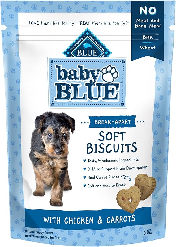 Reward your new puppy with the delicious taste of Baby BLUE Soft Biscuits. These natural dog treats are made with tasty, wholesome ingredients like real chicken, oats, and carrots for a taste dogs love. Blue Buffalo puppy treats are enhanced with DHA, a fatty acid found in mother's milk, to support brain development. They also help promote skin and coat health with Omega 3 & 6 fatty acids. Baby BLUE puppy treats are great for training or an anytime reward. And because they're soft baked, you can break them into smaller pieces for portion control.