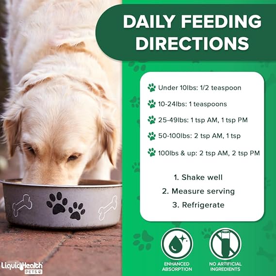 - PERFECT FOR DOGS ALL AGES AND ALL SIZES - Our liquid dog glucosamine hip and joint juice formula is suitable for dogs of all breeds, all ages, and all weights including small dogs and large breeds. Follow the serving size and feeding instructions on our Liquid Health K9 Glucosamine bottle for the best results! We recommend giving your dog their doses of K9 Glucosamine with food or shortly after their meals and refrigerate after use.