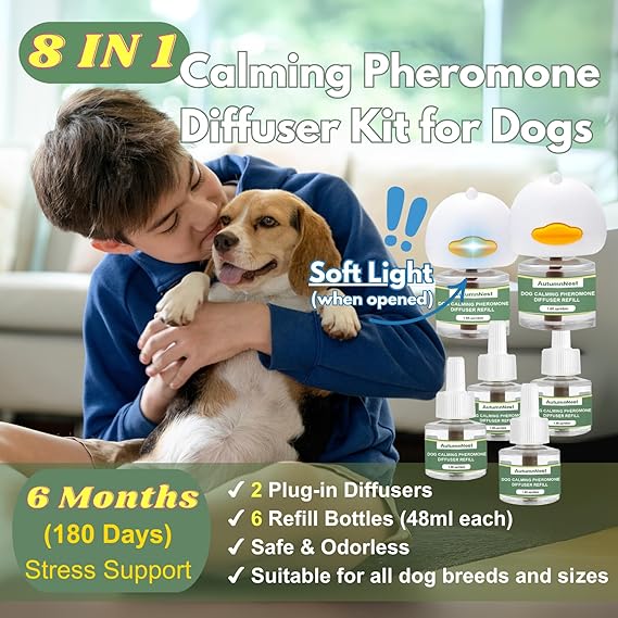 - 【8 IN 1 Extended Comfort Kit - 180 Days Dog Calming Diffusers for Dogs】 AutumnNest offers an upgraded 8-in-1 set of dog calming diffusers for dogs, including 2 plug-in units and 6 refill bottles. This complete kit provides 180 days of continuous stress support, ideal for multi-pet homes to keep your dogs calm, safe, and secure