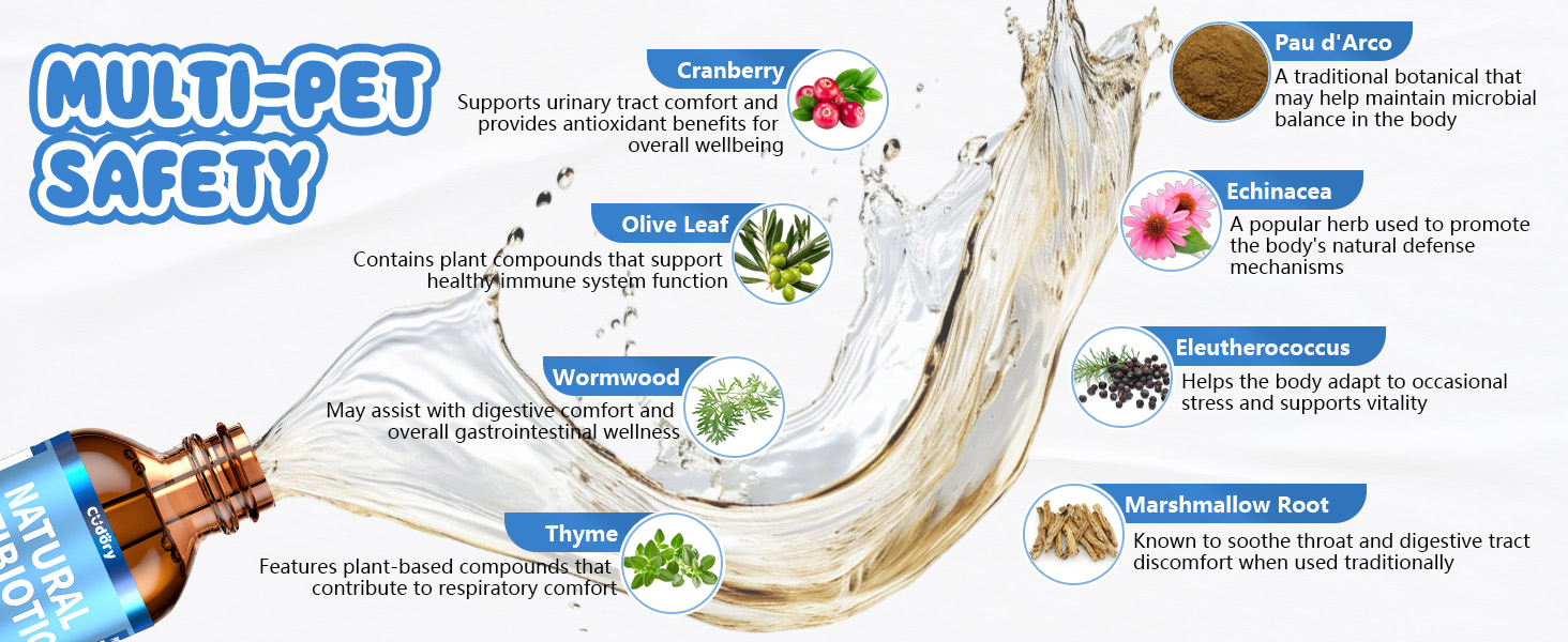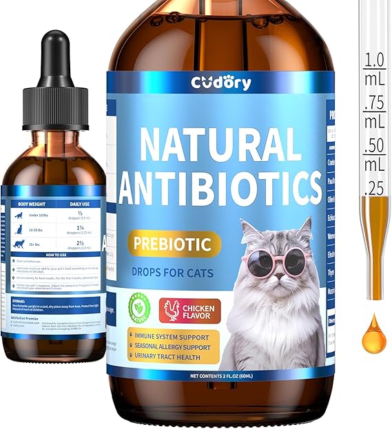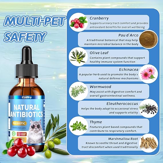 - Natural Antibiotics for Cats - Our cat natural antibiotics feature a unique blend of natural ingredients, including Cranberry, Olive leaf and Pau D’Arco, providing pets' health support. Designed to ease with common issues like seasonal discomfort, skin issue, this natural herbal formula enhances overall vitality and a cheerful mood for your furry friend.