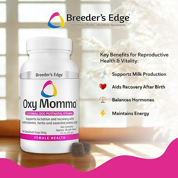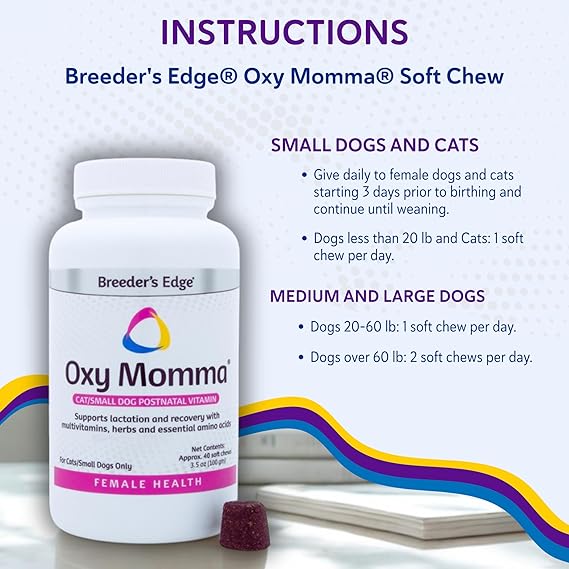 Breeder's Edge Oxy Momma Soft Chews, Postnatal Vitamin Supplement for Lactating Dogs and Cats, Supports Recovery, Hormones, and Next Pregnancy - for Small Dogs & Cats, 40ct Soft Chews