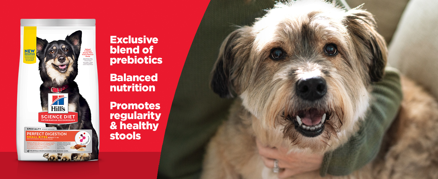 Every dog has an entire ecosystem living within them — the gut microbiome, full of billions of diverse microbes unique to your pet. With the right nutrients to help balance their microbiome, you can actually affect not only their digestive health, but their overall well-being. That’s why we developed Science Diet Perfect digestive small bites dog food with our ActivBiome Technology ingredient blend of prebiotics. It’s a breakthrough nutrition that supports each dogs unique gut microbiome for healthy digestive and balanced nutrition that helps your dog feel their best.