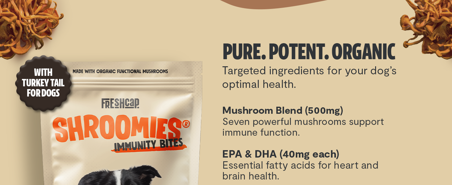 - SEVEN MUSHROOM POWER BLEND - Premium mushrooms for dogs featuring Turkey Tail mushroom for dogs, Lion's Mane, Reishi, Cordyceps, Chaga, Maitake, and Mesima. Our mushroom supplement for dogs combines these powerful fungi to create the ultimate canine wellness formula.