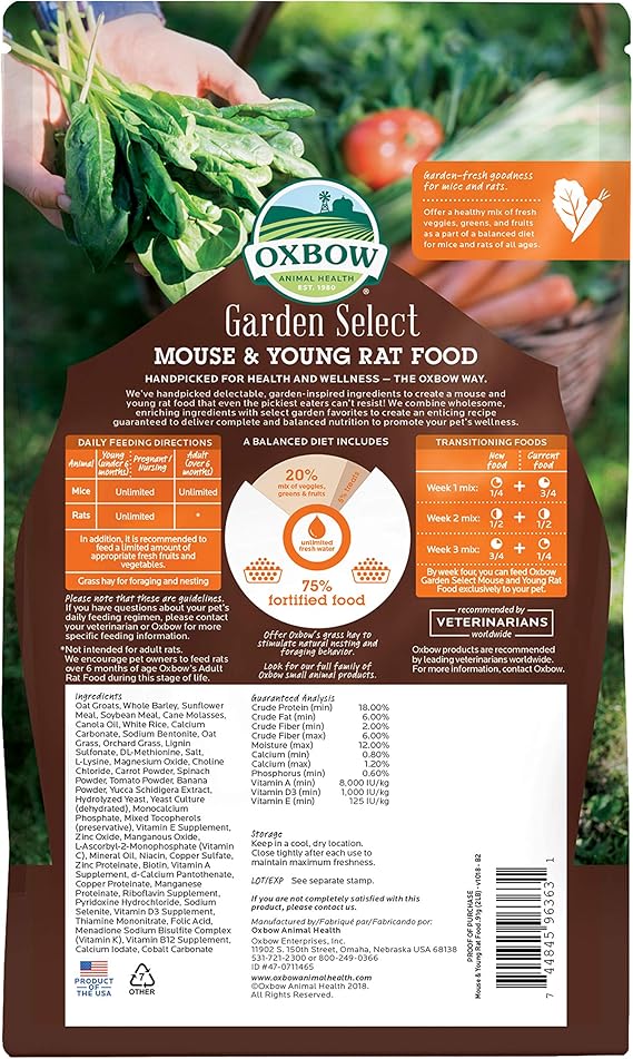 Oxbow Garden Mouse And Young Rat Food is the premium option for young rats and mice of all ages with a discerning palate. This uniform food provides essential vitamins and minerals mice and young rats need to thrive. Uniform pellets provide complete nutrition in every bite and prevent selective feeding. All Oxbow foods are formulated with the guidance of leading small animal veterinarians and nutritionists to provide specialized nutrition for the health and wellbeing of small pets.