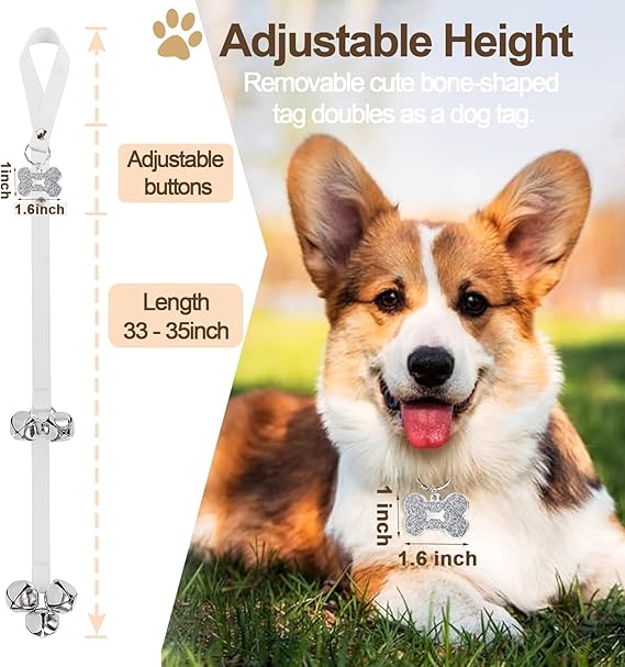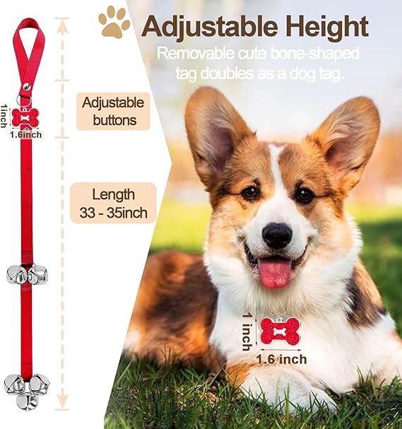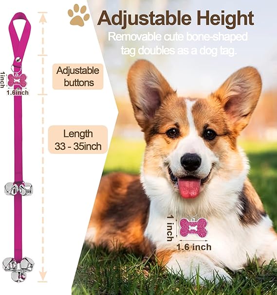 - Adjustable Length: The training bell has a strong buckle that can hang from nearly any doorknobs or handles. You can easily adjust the length between 33'' and 35'' and make it suitable for your dog friends to ring the bell.