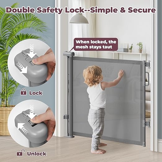 - Child Safety Lock with One Hand Operation: Mesh baby gate features a secure double lock that’s tough for toddlers but easy for adults. Designed for busy parents, easily open or close with one hand while holding a baby, groceries, or multitasking at home