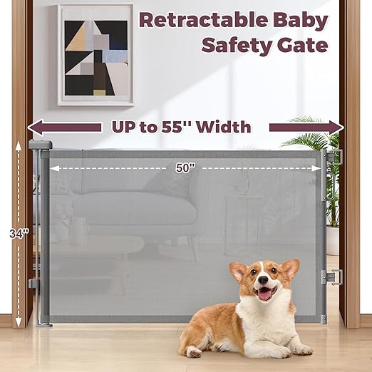 Retractable Baby Gate for Stairs, 55" Wide Mesh Dog Gate Indoor, 34'' Tall Child Gate for Doorways, Hallways, Deck, Indoor Outdoor Pet Baby Safety Essentials for Home, Grey