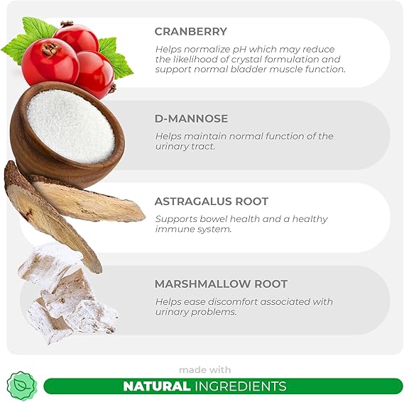 - Balanced urine ph - Helps maintain a normal urine pH level, which is essential for creating an environment less conducive to the formation of crystals and discomfort.
