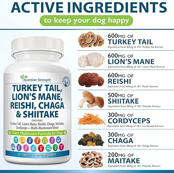 Nutrition Strength 15-in-1 Mushrooms for Dogs Turkey Tail 600mg Lion's Mane 600mg Reishi 600mg Shiitake 500mg Cordyceps 300mg Chaga 300mg Maitake 200mg Meshima Blazei Poria Porcini Enoki Portobello Chewable Tablets are formulated with carefully selected ingredients in an all-in-one mushroom complex for dogs formula, which may help support your pet's well-being and strengthen their immune system. Our real mushrooms for dogs treats are an excellent source of 15 important mushrooms your dog needs, including: