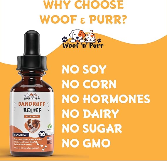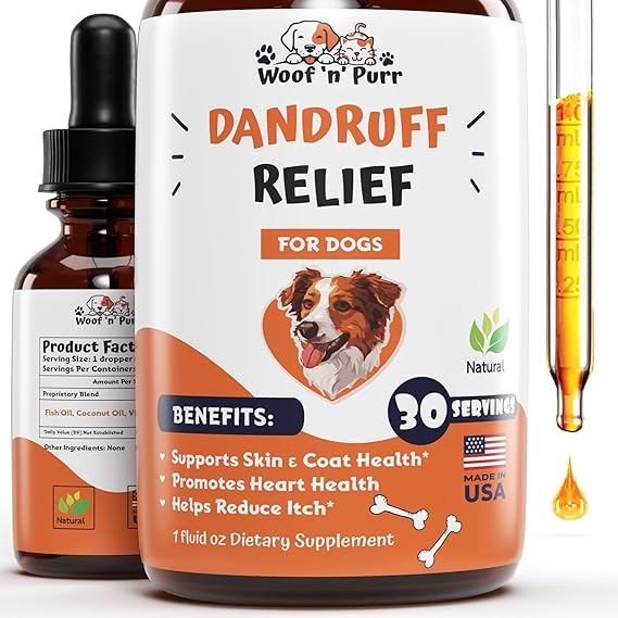 Introducing our Dandruff Relief Tincture for Dogs, the ultimate solution for a healthy, dandruff-free coat! Crafted with care and expertise, this powerful formula combines the natural wonders of coconut oil, fish oil, and vitamin E to provide soothing relief for your beloved pet's irritated skin. Say goodbye to flakiness and hello to silky-smooth fur! Our tincture's unique blend of coconut oil and fish oil deeply hydrates and moisturizes your dog's skin, banishing dandruff and leaving their coat soft, shiny, and irresistibly touchable. Experience the calming touch of vitamin E as it soothes and heals irritated skin. Our tincture's gentle formula alleviates itching and inflammation, providing instant relief for your pet and restoring their skin's natural balance. Give your dog the gift of healthy skin and a radiant coat with our nourishing formula. Coconut oil, fish oil, and vitamin E work together harmoniously to promote skin health from the inside out, ensuring your furry friend looks and feels their absolute best. Trust in our commitment to quality and excellence. Made with premium ingredients and backed by rigorous testing, our Dandruff Relief Tincture is a testament to our dedication to your pet's well-being. Say goodbye to dandruff woes and hello to a happy, healthy pet—order now and watch them strut with confidence!