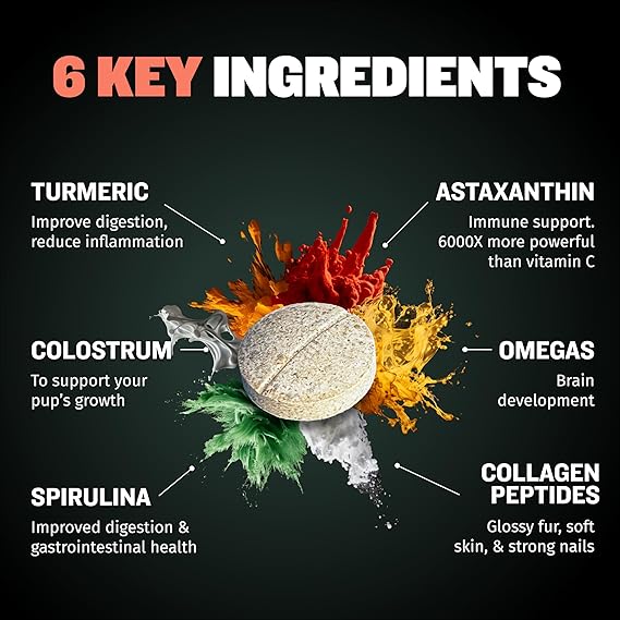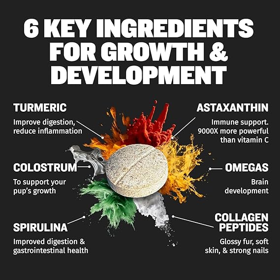 - COGNITIVE, METABOLIC, AND IMMUNITY SUPPORT: Our multivitamin puppy essentials, enriched with choline and omega-3 fatty acids from fish oil, support brain health, metabolism, and immune strength. Fortified with colostrum, it enhances your puppy’s natural defenses. This powerful blend, combined with collagen peptides for joint, skin, and coat health and spirulina for proteins and antioxidants, fosters comprehensive well-being and immunity in your growing furry companion.