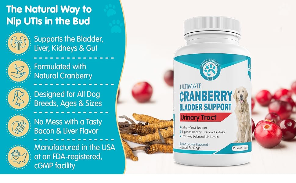 - No More Potty Problems for Your Pup: Worried about UTIs for dogs? These cranberry pills for dogs provide a range of health benefits beyond just urinary tract support. This cranberry supplement for dogs will help support the liver and kidneys, and help ease leaky gut syndrome. The result is more wagging tails and fewer trips to the vet for dog urinary tract infection treatment.