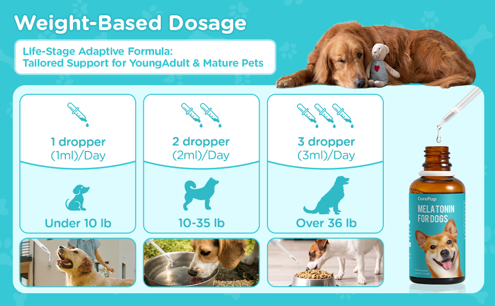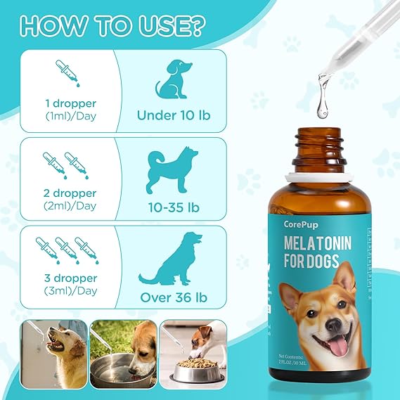 - For All Breeds And Sizes Of Dogs: Melatonin for dogs to sleep for all types of small, medium and large dogs. Suitable for daily consumption, liquid melatonin for dogs serving size depends on the dog's weight. Consistent use is recommended for best results