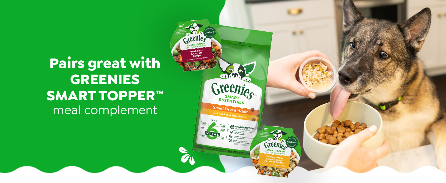 The Greenies brand is on a mission to promote your dog’s well-being from teeth to tail! Greenies Smart Essentials Small Breed Adult High Protein Dry Dog Food Real Chicken & Rice Recipe offers science-backed nutrition with an irresistible taste. This nutritious dog food recipe features real chicken as the #1 ingredient and is designed to help support 6 key areas of your dog’s health: digestion, immune system, teeth, skin & coat, bones & joints, and muscles, including the heart. Greenies Smart Essentials Small Breed Adult Dry Dog Food is formulated without corn, wheat, soy, or chicken by-product meal and no artificial flavors or fillers*. Made with natural ingredients plus vitamins, minerals, and nutrients, Greenies Smart Essentials Small Breed Adult High Protein Dry Dog Food is guaranteed to bring joy to mealtime with tail-wagging flavor. Love it or your money back! *Trace amounts may be present due to potential cross-contact during manufacturing