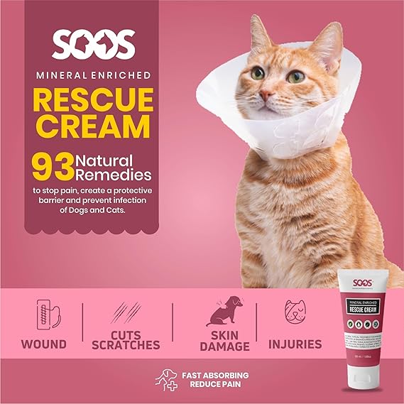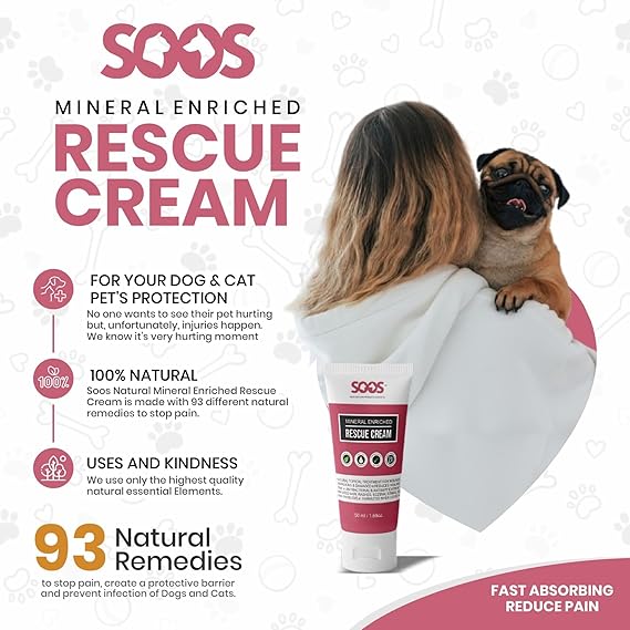- 100% NATURAL: Soos Natural Mineral Enriched Rescue Cream is made with 93 different natural remedies to stop pain, create a protective barrier and prevent in-fection of Dogs and Cats. You will be amazed at how fast the injury heals