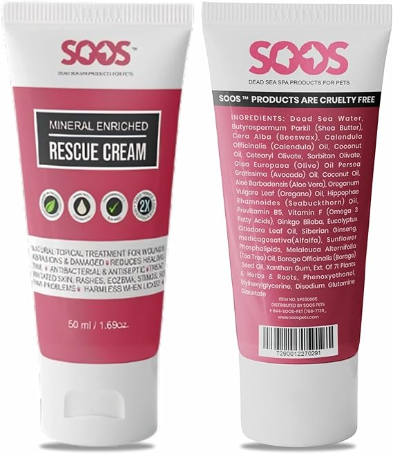 Soos Pets Pet Rescue Cream for Dogs and Cats | Natural Dead Sea Mineral Enriched | Fast Absorbing Reduce Pain | Topical Treatment of Injuries Cuts Sores Wounds Scratches Damaged Skin - 50ml