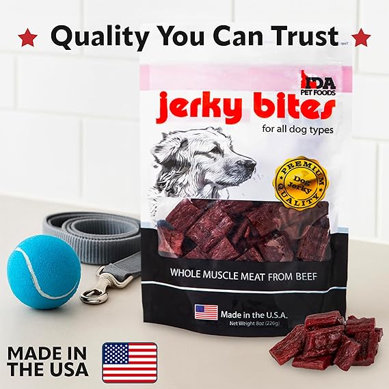 Introducing Ida Pet Foods Beef Jerky Bites 8oz (Pack of 1) - the ultimate choice for discerning dog owners who prioritize quality and nutrition. Our beef dog chews are meticulously crafted to cater to the unique dietary needs of your beloved pets, ensuring every bite is a wholesome experience. At Ida Pet Foods, we pride ourselves on producing jerky bites dog treats that are soy free, grain free, and devoid of any artificial colors, making them an exemplary option for those seeking soy free dog treats. Our Beef Jerky Bites are made from 100% pure beef protein, with no fillers or byproducts. We use only the finest whole muscle meat, identical to the cuts of beef you would find at your local market. This commitment to quality assures that every chew not only meets but exceeds the expectations of conscientious pet owners. Designed for dogs of all sizes and life stages - whether you have a playful puppy, an energetic medium-sized dog, a large companion, or a cherished senior - these treats for dogs provide the essential nutrients needed for a balanced diet. Our dog treats are crafted to be a versatile option for small, medium, and large dogs, ensuring that no furry friend is left out. Moreover, these beef-flavored treats for dogs are specially formulated to be gluten-free, catering to dogs with specific dietary requirements. Our gluten-free dog chews offer a palatable, high-protein snack that supports healthy muscles and overall well-being. Ida Pet Foods takes pride in producing beef jerky dog chews made in the USA, ensuring the highest standards of safety and quality. Our chews for dogs are organ free, making them a reliable choice for those seeking nutrient rich dog treats without any unnecessary additives. Whether you are searching for dog treats for puppies or for senior dogs, our dog treats made in the USA cater to all life stages. Elevate your pet’s snacking experience with Ida Pet Foods Beef Jerky Bites, where quality meets nutrition in every chew.