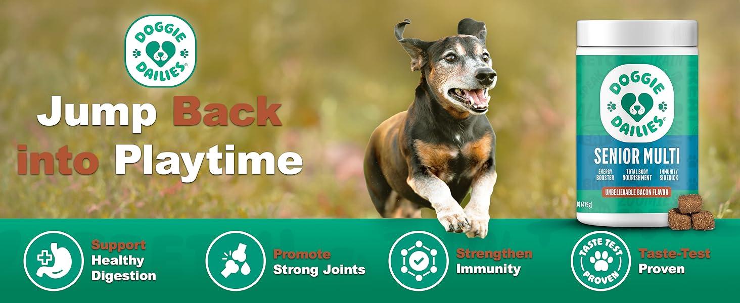 - Targets 10 key areas of your dog's health. Our delicious bacon flavor senior dog vitamins provide antioxidant support plus nutritional support to help maintain strong joints and bones, and support cognitive, heart, eye, and liver function