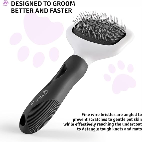 - USE POODLE PET’S PET GROOMING TOOL ON DOGS AND CATS: The primary purpose of this slicker brush is to get rid of any debris, loose hair mats, and knots in the fur. It is rectangular in shape and has fine wire bristles packed tightly together. Each wire bristle is angled slightly to prevent scratches to the skin.