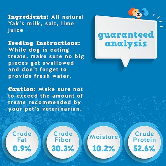 - Delicious And Nutricious - The Yak milk dog chew is a protein-rich dog treat, in addition to low in calories and fat. Contains no meat and is naturally processed to be 100% lactose free. These organic cheese sticks are rich in iron and essential fatty acids, such as Omega-3 and Omega-6.