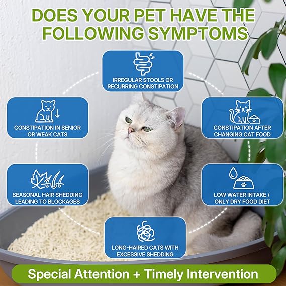 - CAT CONSTIPATION RELIEF: This cat constipation supplement features a liquid formula for fast absorption, providing quick relief from discomfort such as straining or dry stools. It's ideal for supporting digestive rhythms and helping maintain regularity.