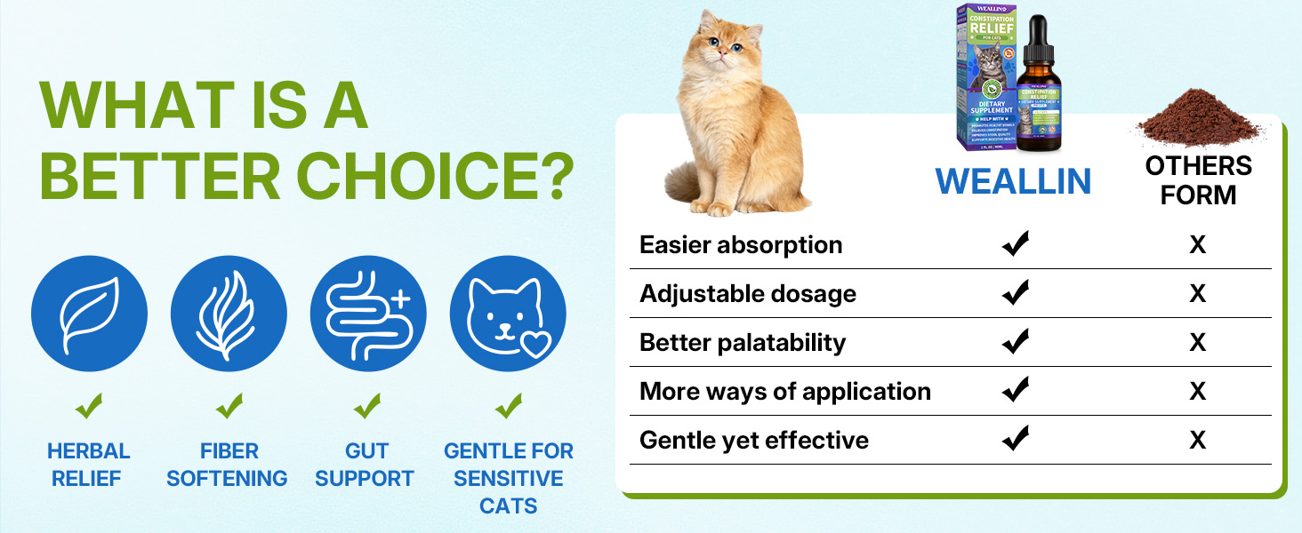 - GENTLE DIGESTIVE SUPPORT: WEALLIN constipation relief supplement for cats is made from 100% natural herbs and nutrients, designed to gently support your pet’s digestive system without synthetic chemicals or unnecessary fillers.