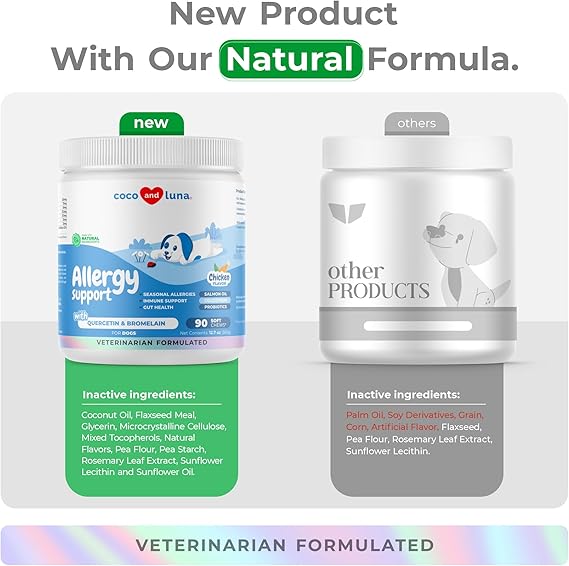 - Allergy Support for Dogs - Coco and Luna Allergy Support uses the best natural ingredients to address internal and external symptoms to calm most allergies that may affect your dog.