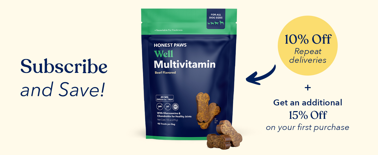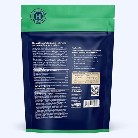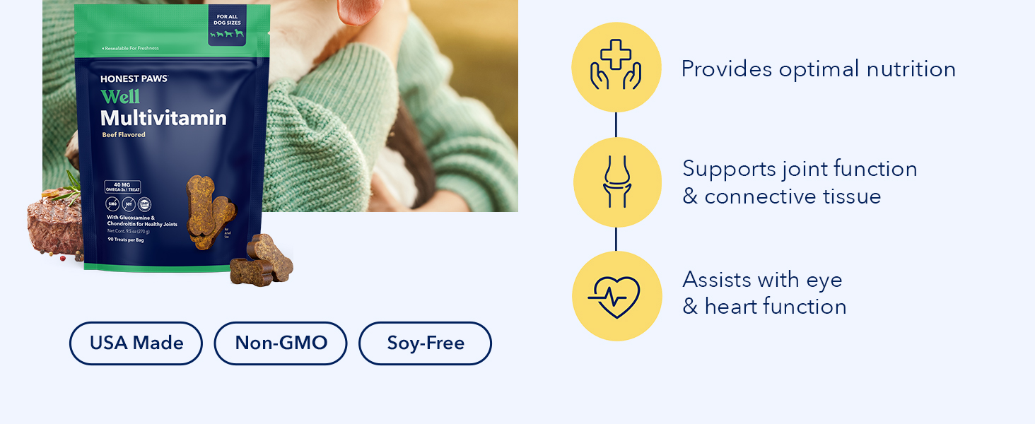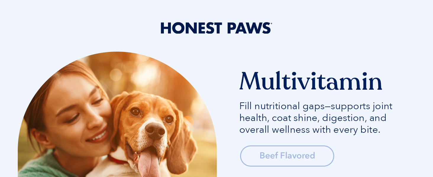 Honest Paws (90 Count) Dog Multivitamin Soft Chews with 10 Essential Vitamins - Joint, Coat, Immune, Eye & Heart Support - with Glucosamine, Chondroitin & Omega-3 - Beef Flavor