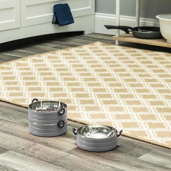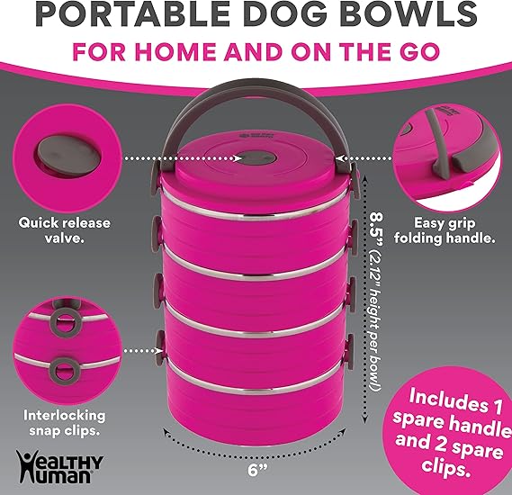 - __ SIZE AND SPECS The set of 3 pet bowls measures 6Ó across and 6.5Ó in height. Set includes 2 spare interlocking clips and a spare easy-grip handle. Ideal for Small and Medium dogs, available in Pink, Green and Blue Ð pick the color that pup loves best. Stainless steel interior is easy to clean. While the Go Pet travel bowls were primarily designed for dogs, they are just as awesome for other pets!