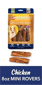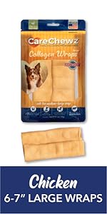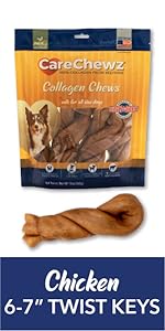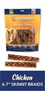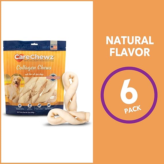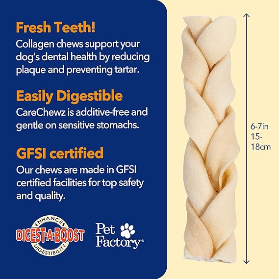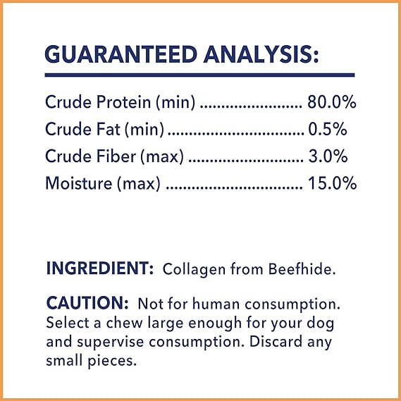 CareChewz are 100% collagen, a healthy choice for a daily chew that provides your dog with a long-lasting safe chew that combines excellent dental care and the benefits of all-natural collagen from beefhide. Made entirely in the USA with only collagen from USA Beefhide. These dog treats are manufactured following strict Global Food Safety Initiative standards. Disclaimer: Meant for intermittent usage. Select a chew large enough for your dog and supervise consumption. Discard any small pieces.