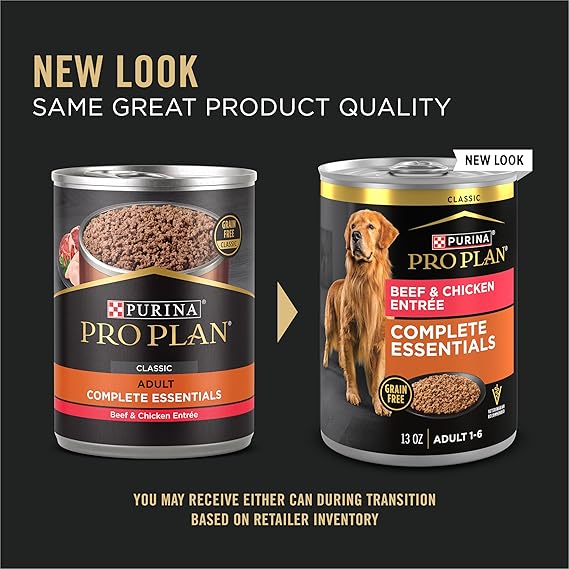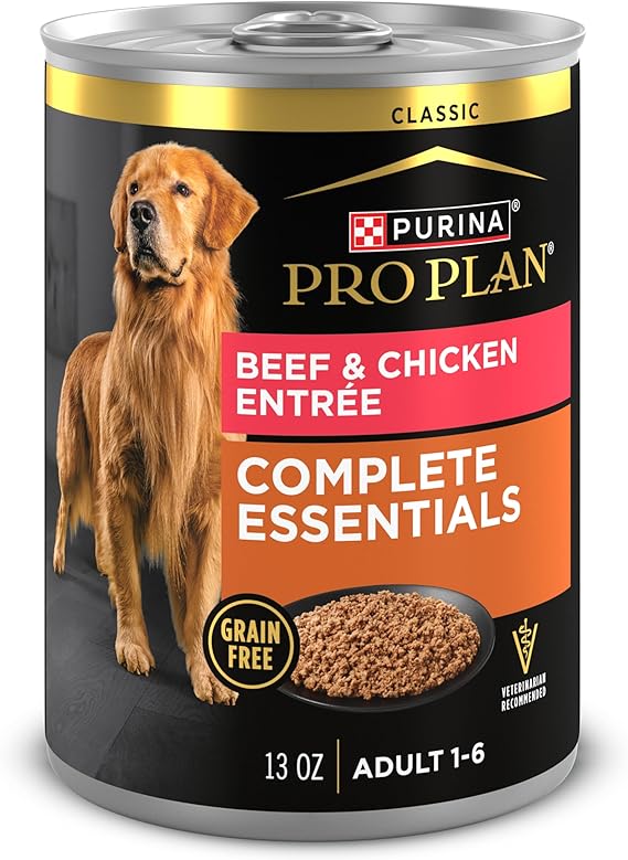 Combine advanced nutrition and outstanding taste with Purina Pro Plan COMPLETE ESSENTIALS Grain Free Classic Beef and Chicken Entree adult wet dog food. This grain free high protein dog food uses real beef as the number 1 ingredient with real chicken, helping provide high-quality protein to help build lean muscles. It's made with no corn, wheat or soy and no artificial colors, flavors or preservatives. Our canned beef and chicken dog food has an optimal protein level for maintaining an ideal body condition. With 23 essential vitamins and nutrients to support overall health and wellness, this no grain dog wet food provides 100 percent complete and balanced nutrition for adult dogs. Every ingredient is carefully chosen for a specific nutritional or functional purpose for a high-quality meal that tastes great. Dish out this canned dog food pate on its own for a meal that makes his tail wag, or add variety in taste and texture by combining this canned pate dog food with dry dog food.