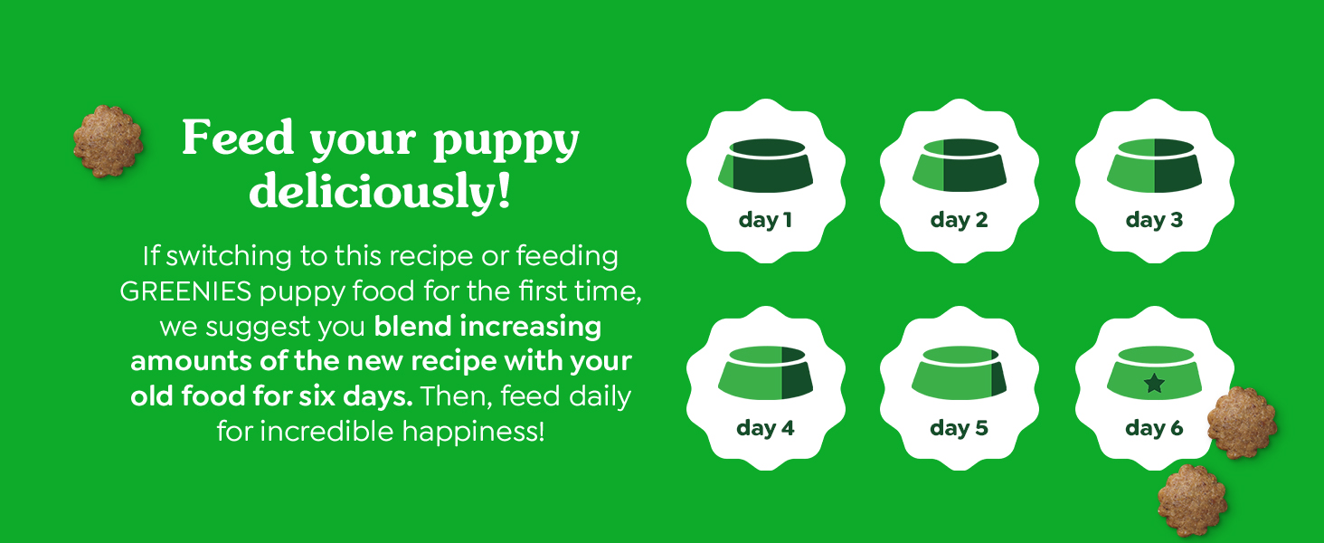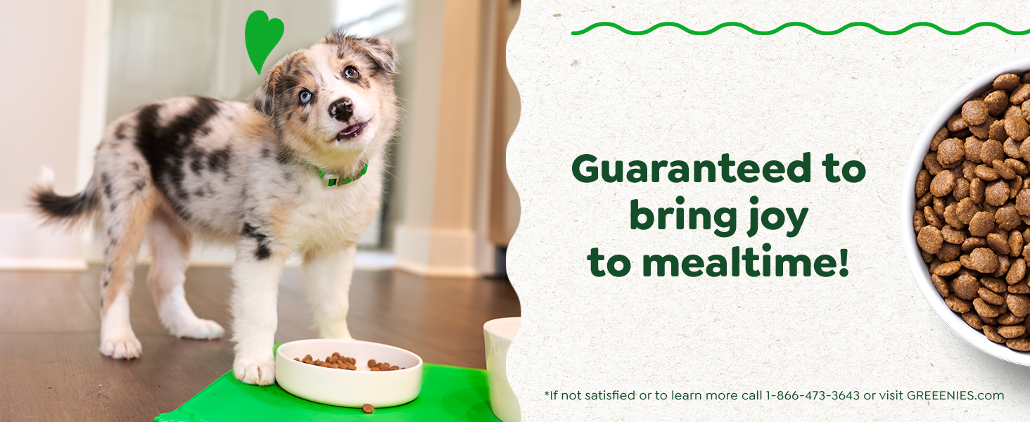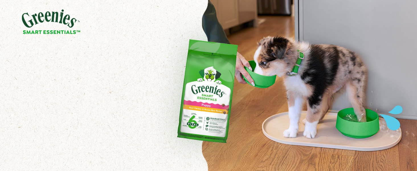 The Greenies brand is on a mission to support your puppy’s well-being from teeth to tail! Greenies Smart Essentials Puppy High Protein Dry Dog Food Real Chicken & Brown Rice Recipe offers science-backed nutrition with an irresistible taste. This nutritious puppy food recipe features real chicken as the #1 ingredient and is designed to help support 6 key areas of your puppy’s health: digestion, immune system, teeth, skin & coat, bones & joints, and muscles, including the heart. Greenies Smart Essentials Puppy Dry Dog Food is formulated without corn, wheat, soy, or chicken by-product meal and no artificial flavors or fillers*. Made with natural ingredients plus vitamins, minerals, and nutrients, Greenies Smart Essentials Puppy High Protein Dry Dog Food is guaranteed to bring joy to mealtime with tail-wagging flavor. Love it or your money back! *Trace amounts may be present due to potential cross-contact during manufacturing