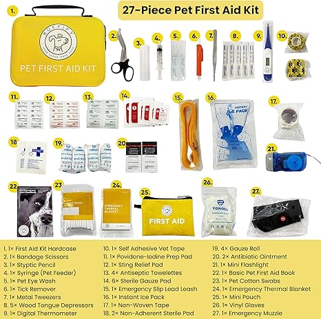 - COMPREHENSIVE DOG FIRST AID KIT: Includes 27 essentials and emergencies for dogs, cats, and small pets. Perfect dog car accessories and for home use.