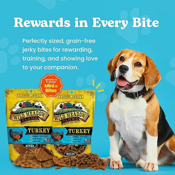 - CLASSIC JERKY TREATS: Crafted in a larger size than our Classic Jerky Minis, our Wild Meadow Farms Classic Jerky Bites are ideal for daily indulgence. Soft and easy to tear, they suit dogs of all ages and stages, ensuring every pet enjoys a satisfying treat experience.