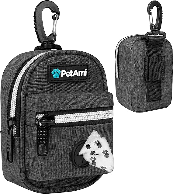 - STRIPE BLACK & WHITE DOG WALKING BAG: PetAmi poop bag holder dispenser includes one roll of dog poop bags, measures 4.7 x 1.8 x 3 inches, and is made of durable oxford polyester. Cute mini backpack doggy trash bag carrier is refillable and is compatible with most dog poop bag rolls. This pet travel bag is a great gift for dog mom, dad, parents, owners and trainers. Comes in multiple colors to mix and match your dog leash.