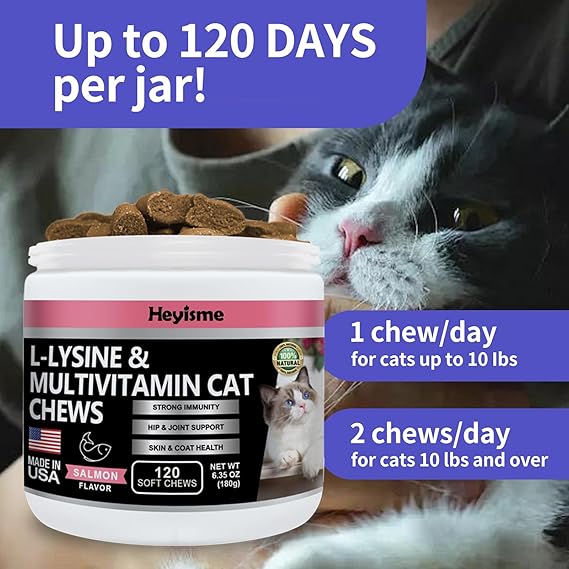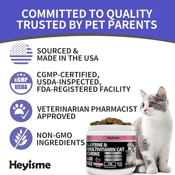 - Complete Cat Health Enhancer: Presenting HEYISME scientifically crafted and veterinarian-approved lysine for cats and multivitamin Cat Treats - a comprehensive approach to your cat's well-being. Made in USA, reliable and suitable for cats of all ages, it's the go-to supplement for pet guardians around the world.