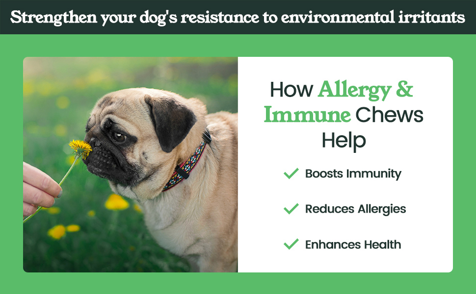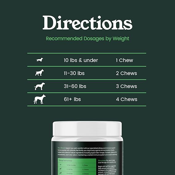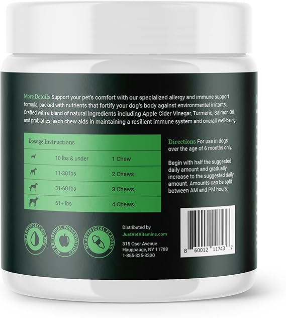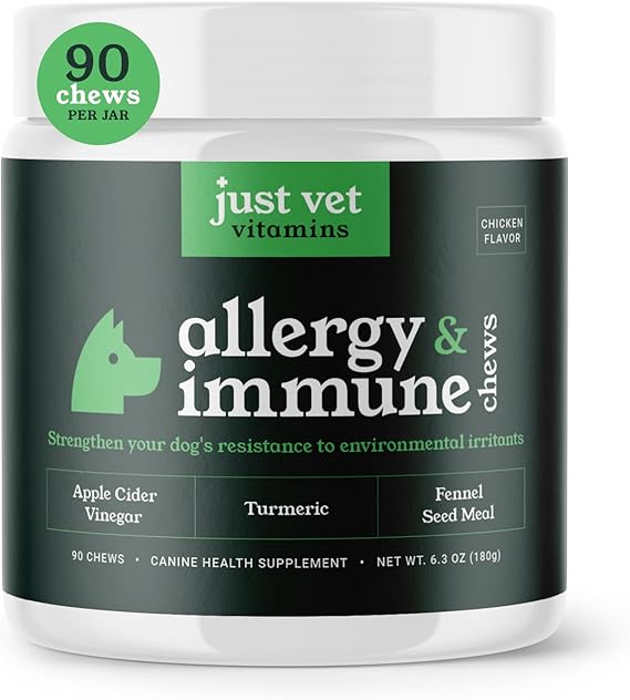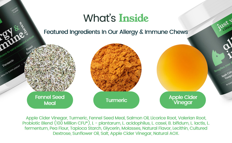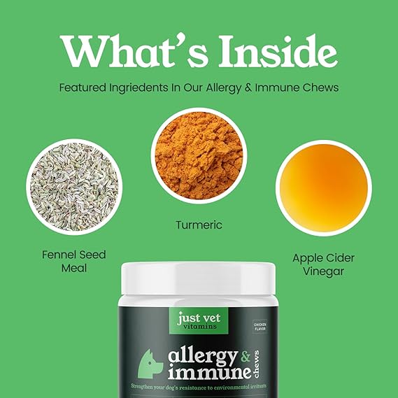 - Packed with Fennel Seed Meal, Turmeric, and Apple Cider Vinegar, these chews provide powerful support for your dog’s immune system while helping to alleviate seasonal allergies naturally.