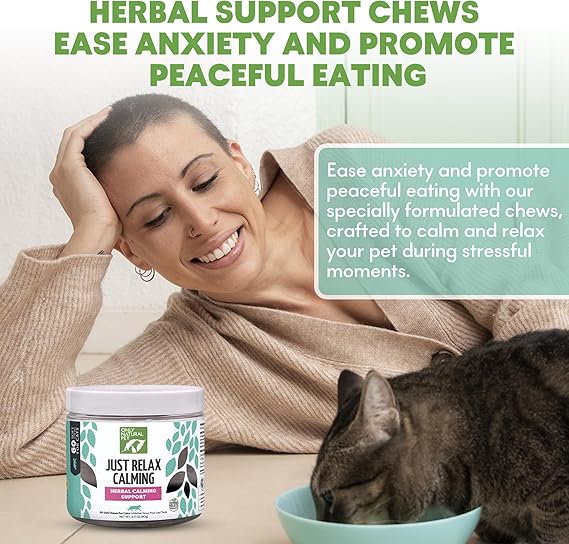 - CALMING RELIEF: Just Relax Herbal Chews offer a natural solution to alleviate anxiety, nervousness, and stress in cats. Formulated with a synergistic blend of herbs, including valerian, chamomile, and skullcap, to help soothe and relax.