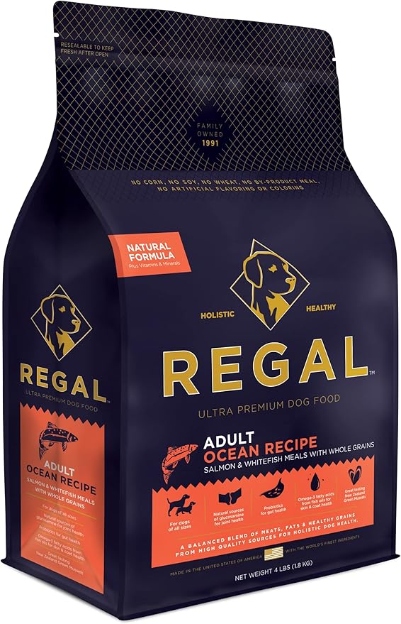 Regal Pet Foods Adult Ocean Recipe (Salmon) All Natural, Slow Cooked Whole Grain Dry Dog Food for All Breeds and Sizes of All Life Stages - Made in The USA, 4 LB Bag