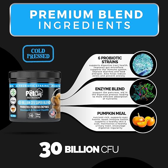 - Pet Chef Preimum Dog Probiotics - Dog Supplements by Pet Nutritionist specially formulated dog probiotic blend of prebiotics enzymes for senior dogs and puppies are designed to support your pet's digestive health, stomach micro flora, and bowel movement that stop itching and dog scooting. Builds, retorse and maintains a healthy dog. Better dog gut flora and promotes overall well-being.