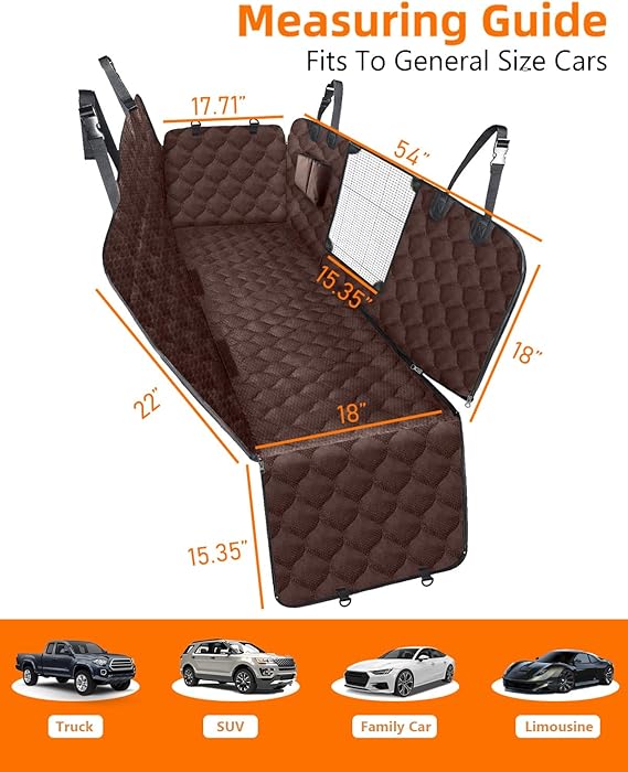 - Perfect Fits Your Car: Perfect size of 54"W x 58"L fits different vehicles like cars, trucks, SUVs! Supplies your pets with comfort while keeping your vehicle interior safe from scratches, fur, and urine (100% waterproof). It also perfects for protecting cars from damage caused by baby car seats. And for kids, it can protect the back seat from food and juice spills.