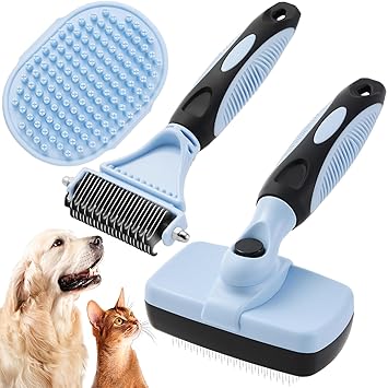 - All-in-One Grooming Solution: This grooming set is the ultimate tool for pet care, featuring a dog brush, cat brush, and deshedding comb to address shedding, tangles, and cleaning needs all in one package. Equipped with a self-cleaning slicker brush, de-matting comb, and dog bath brush, it’s perfect for shedding dogs and indoor cats, ensuring healthier, smoother fur while keeping your home tidy.
